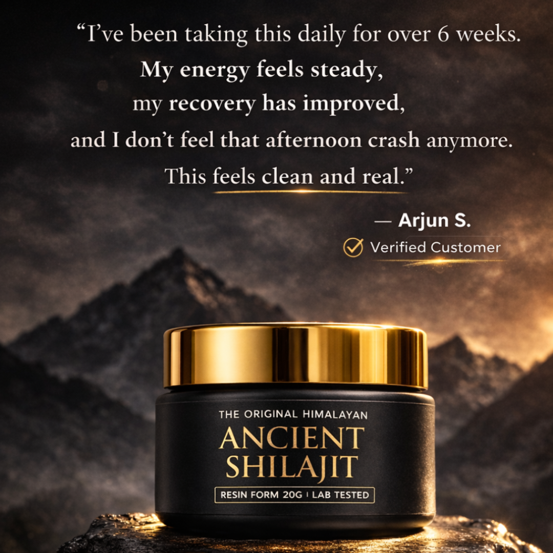 Rich in fulvic compounds and 85+ naturally occurring minerals, Ancient Shilajit supports cellular energy production, hormonal balance, and physical resilience helping improve focus, stamina, recovery, and day-long vitality from within.