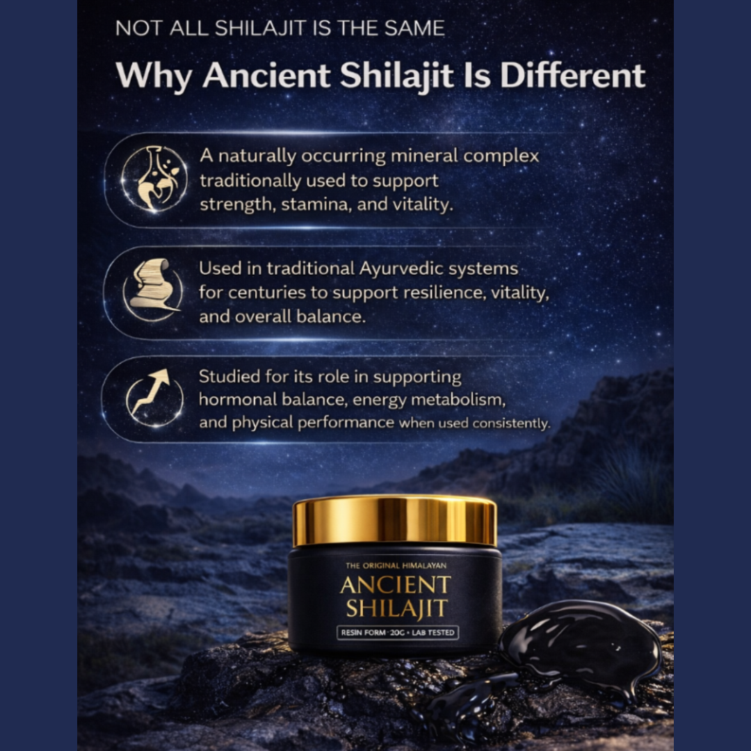 Ancient Shilajit supports healthy hormonal balance through naturally occurring fulvic compounds and trace minerals — helping vitality, confidence, and physical presence without stimulants, synthetics, or artificial boosters.